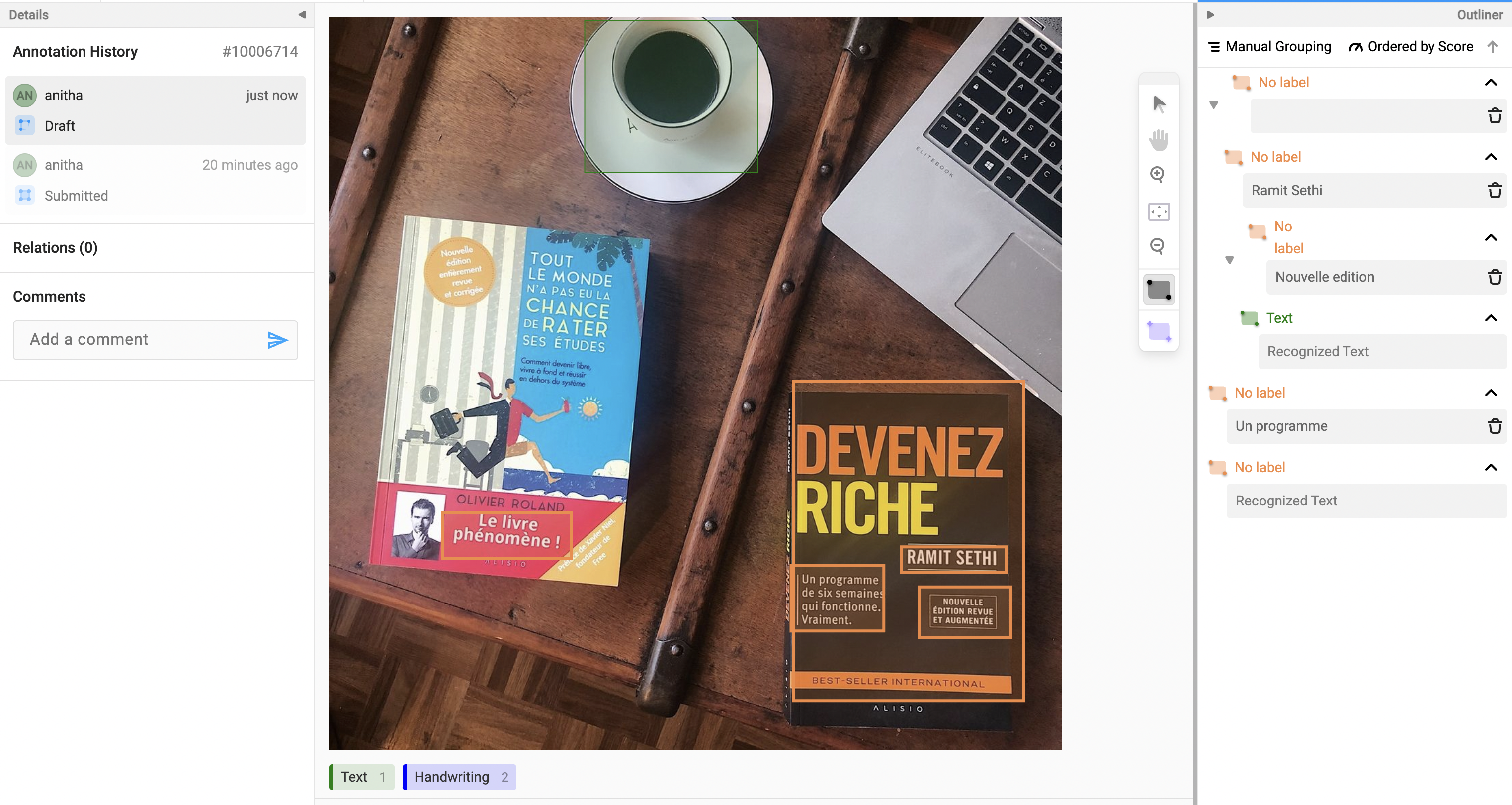 Outliner is the area where you can see all the details about annotation, regions, and labeling history. It is split into two panels, named Outliner and Details. Figure 3 shows the appearance of the Outliner panel on the right of the image and Details panel on the left of the image.