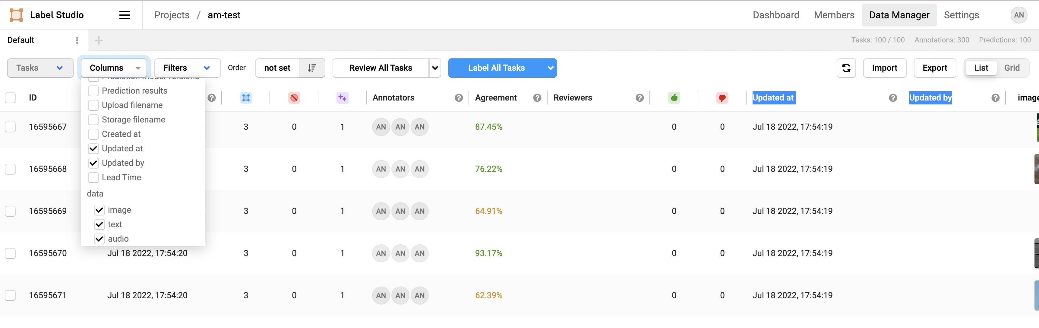 Last updated bycolumn in Data Manager with information ofupdated_at-updated_by, annotator/reviewer (the person who made the last modifications for any of the annotations in this task) atupdated_attime.